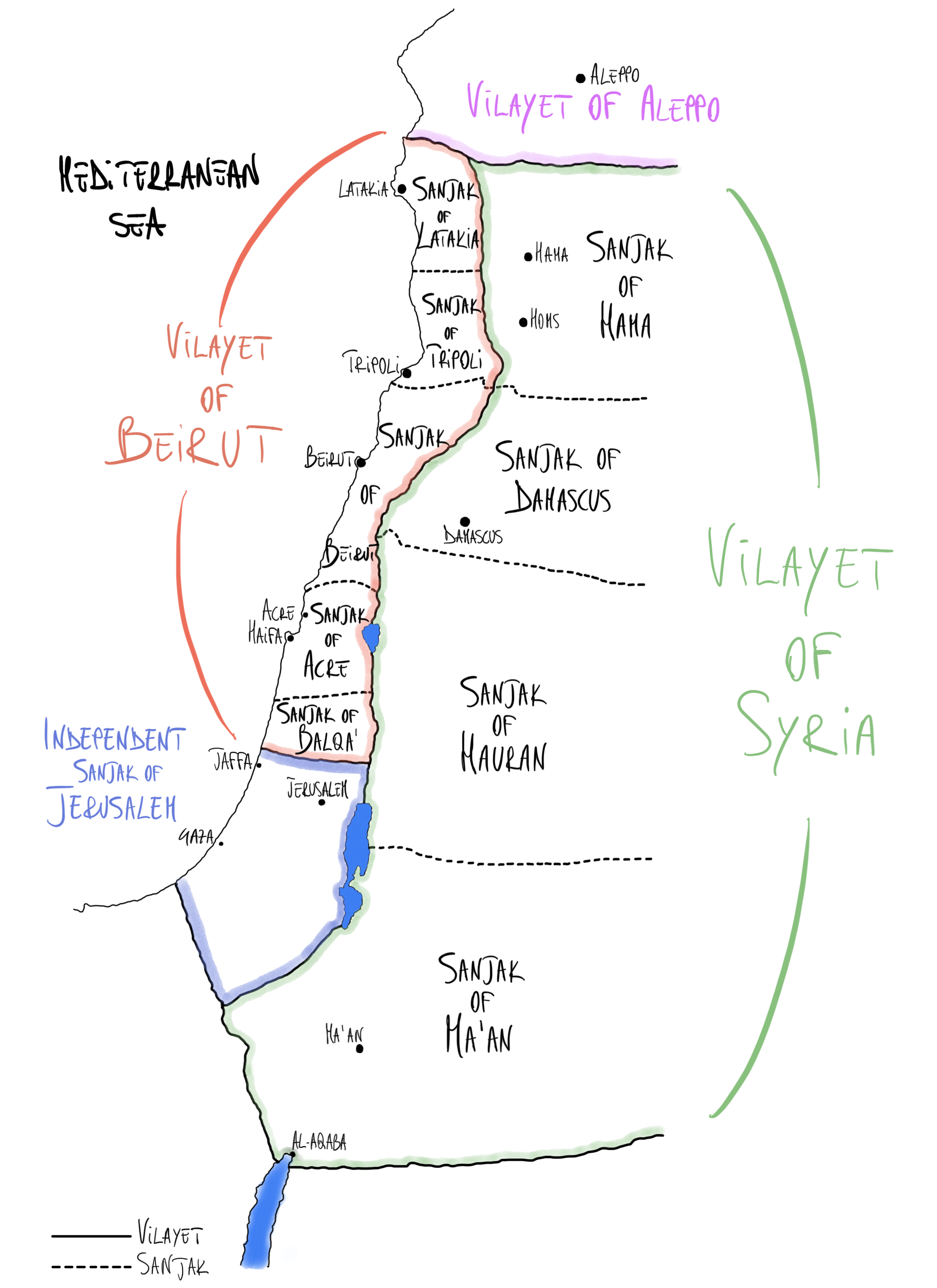- In the 19th century, the Palestinian region was therefore divided into five Sanjak: Gaza, Nablus, Jerusalem, Lajun, and Safad. These Sanjaks were part of the Vilayets of Syria, which were governed by the city of Damascus.