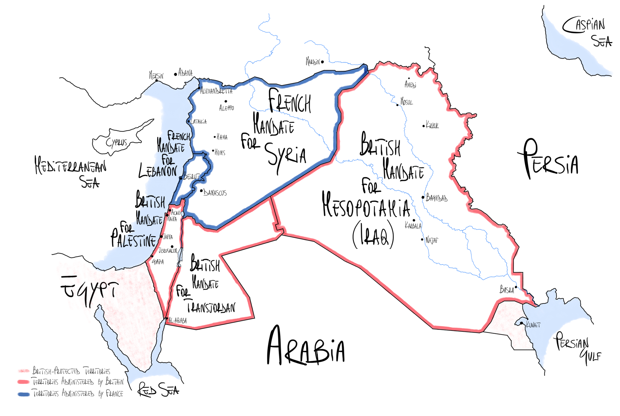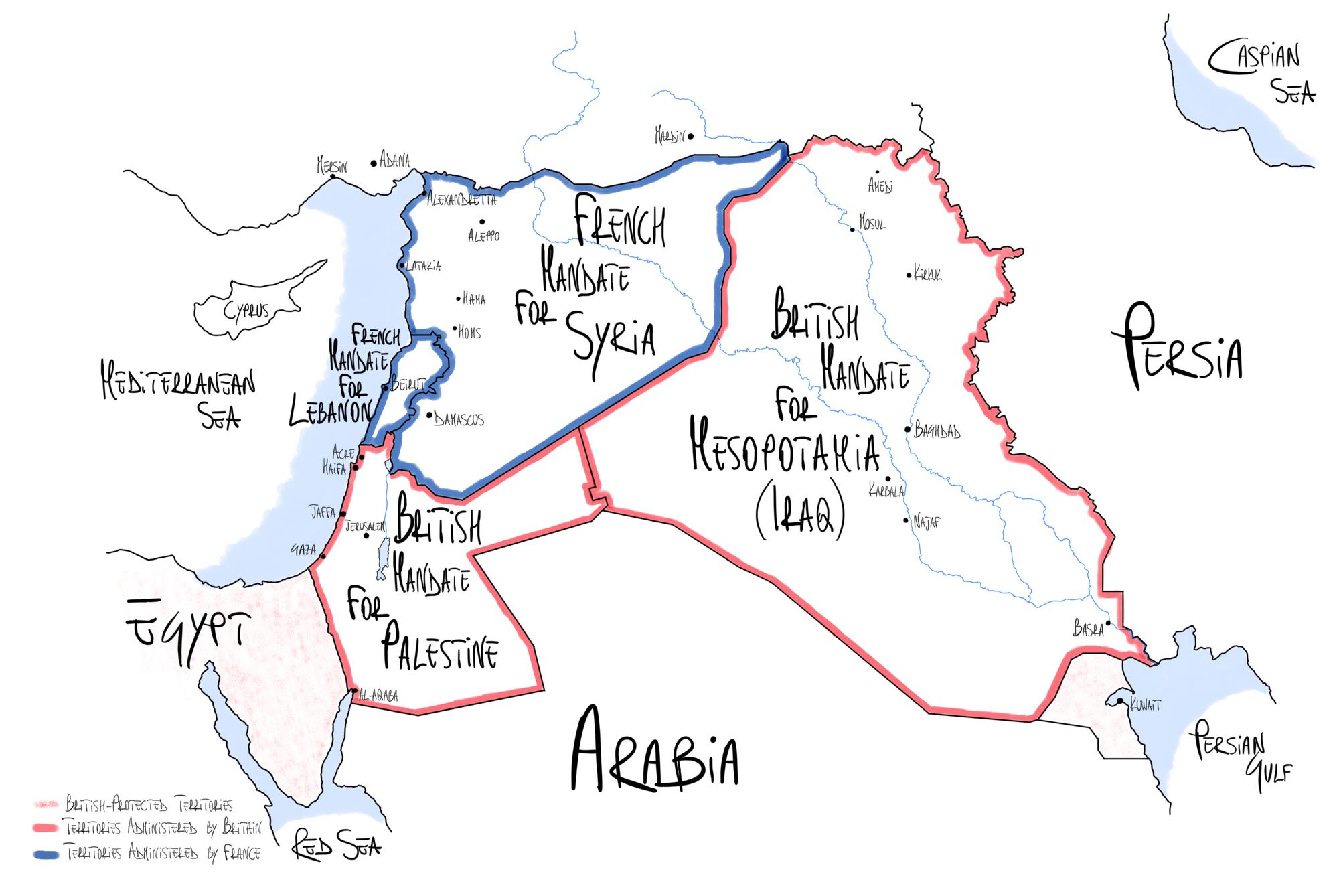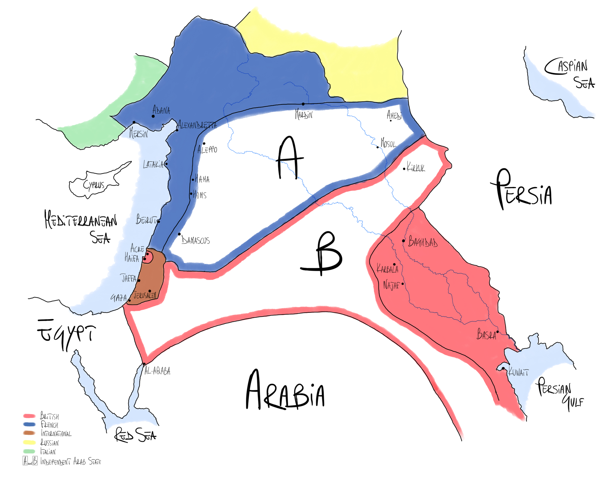 “France and Great Britain are prepared to recognize and protect an independent Arab State or a Confederation of Arab States in the areas (A) and (B) marked on the annexed map, under the suzerainty of an Arab chief. That in area (A) France, and area (B) Great Britain, shall have priority of right of enterprise and local loans. That in area (A) France, and in area (B) Great Britain, shall alone supply advisers or foreign functionaries at the request of the Arab State or Confederation of Arab States” (Sykes-Picot Agreement, 1916). (Map 3)