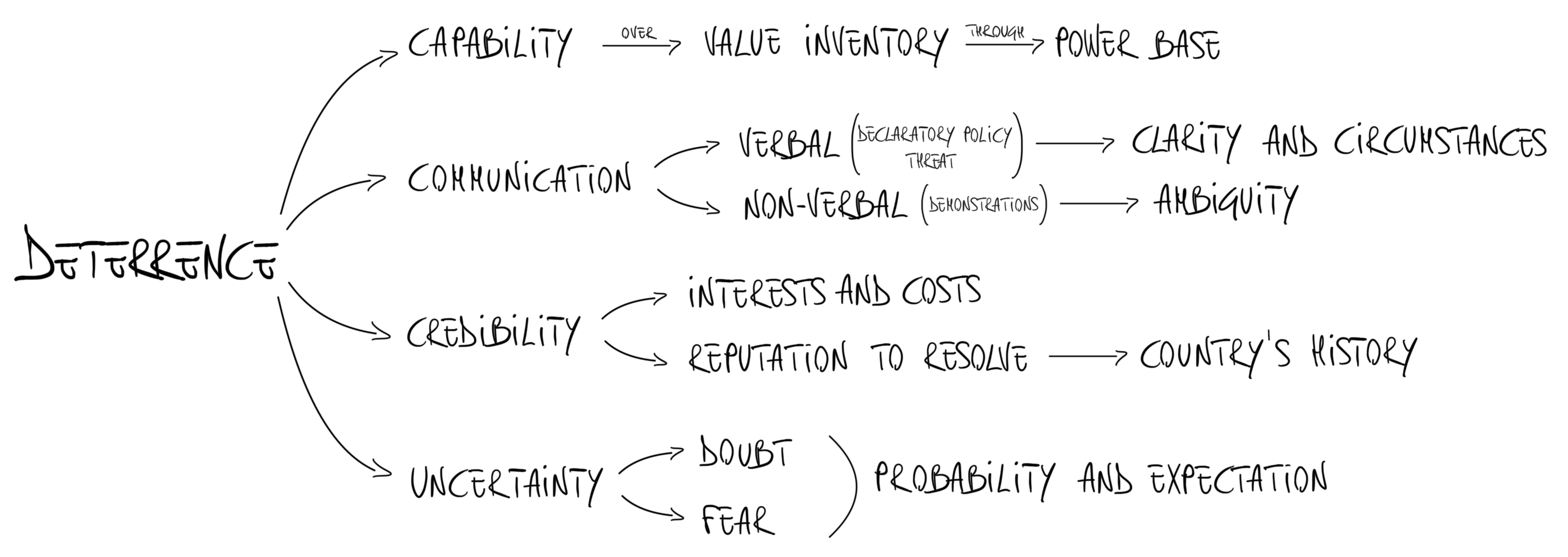 “deterrence may follow, first, from any form of control which one has over an opponent’s present and prospective ‘value inventory’ [Capability]; secondly, from the communication of a credible threat or promise to decrease or increase that inventory [Communication]; and, thirdly, from the opponent’s degree of confidence that one intends to fulfill the threat or promise [Credibility]” (p.10).