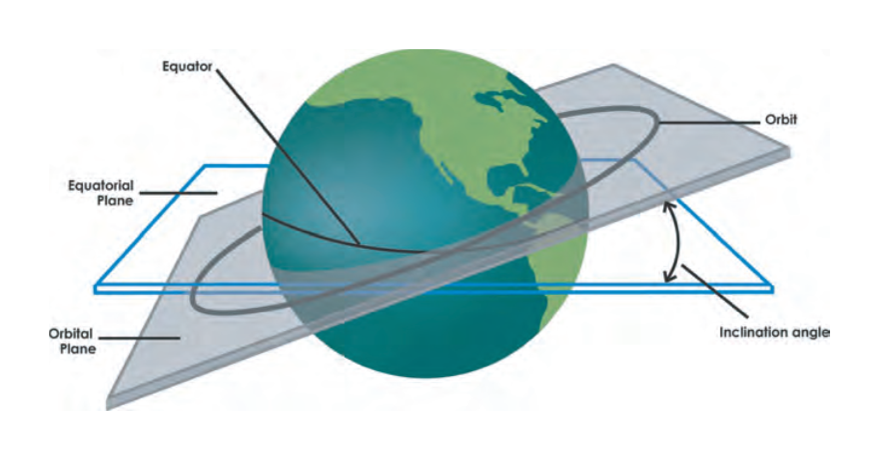 Describing the orbital plane as the imaginary plane on which the orbit lies and the equatorial plane as the equator one, the inclination of the orbit is defined as the angle created by the intersection of the two planes, and the points where the orbit crosses the equatorial plane are defined as nodes (Figure 5).